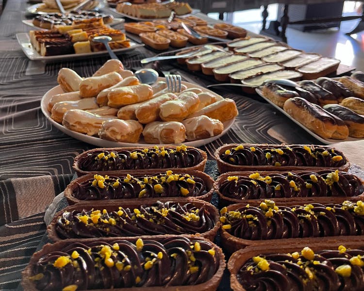 Au menu, et suivant l'inspiration de notre Chef Samuel, vous pourrez retrouver : Viennoiseries, pancakes, omelette minute, oeufs brouillés, bacon, saucisses de volaille, oeufs mimosa, quiches, riz chauffé, pommes de terres rôties, mini choux, tartelettes, entremets, pâtisseries créoles, fruits frais, grillades de bœuf et poissons, verrines sucrées, salées, gâteaux maison, et encore bcp d'autres gourmandises...